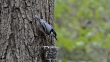 A male white-breasted nuthatch (Sitta carolinensis) discards many preliminary choices and finally selects a sunflower seed and flies away. Then a female selects a peanut piece and climbs the tree.