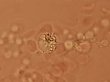 Microscope 800x view of red blood cells and a neutrophil white blood cell moving on an examining plate. Panasonic GH2 plus Zeiss adapter.