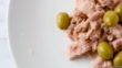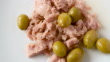 White meat tuna in olive oil and green olives salad - 4K stock video