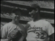 1963 MS Whitey Ford and Sandy Koufax stand on baseball field / New York City, New York, United States