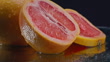 An artistic composition featuring whole and sliced Grapefruit elegantly arranged on a mirror-like surface. The reflective backdrop adds depth and abstract quality to the image, making it ideal for modern food photography, creative advertising campaigns, and design projects that require a unique and visually striking element. The soft hues and abstract reflection capture attention, perfect for various creative uses. ProRes 422HQ - 120fps