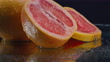 An artistic composition featuring whole and sliced Grapefruit elegantly arranged on a mirror-like surface. The reflective backdrop adds depth and abstract quality to the image, making it ideal for modern food photography, creative advertising campaigns, and design projects that require a unique and visually striking element. The soft hues and abstract reflection capture attention, perfect for various creative uses. ProRes 422HQ - 120fps