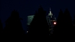 WIDE ANGLE OF LIGHTS AT TOP OF DOWNTOWN ATLANTA SKYSCRAPERS, PROMENADE BUILDING AND 1180 PEACHTREE. AS SEEN FROM BEHIND ROW OF TALL TREES.