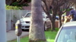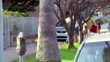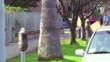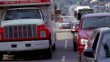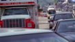 WIDE ANGLE OF STREET TRAFFIC. SLIGHT PAN TO LEFT AS CAR PARALLEL PARKS IN FOREGROUND AND SALEEN S281 SILVER FORD MUSTANG CONVERTIBLE CAR DRIVES ONTO SIDEWALK. MOVERS CARRYING CARDBOARD BOXES FROM U-HAUL TRUCK AND VENDOR WITH "STAR MAPS HERE" SIGN JUMP ASIDE. STUNTS. SUNSET BLVD AND OGDEN DRIVE, WEST HOLLYWOOD.