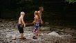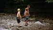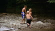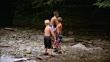 Wide shot boys carrying large piece of driftwood onto bank of stream / Stony Brook State Park, New York - HD stock video