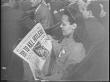 Wide shot Democratic National Convention floor layered with faces of Franklin Roosevelt and Henry Truman / FDR's nomination is cheered / several people are reading newspapers in the crowd with headlines that read, Japanese Cabinet Resigns and Try to Kill Hitler / several notable people look on including James Farley and his wife, Stanton Griffis and Frank Hague, Mayor of Jersey City.