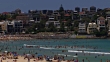 Wide shot of crowded Bondi Beach on a sunny summers day, point of view from behind the skate park (in foreground) facing North Bondi / zoom into crowd swimming sunbathing, sea of umbrellas, surf lifesavers patrolling, Bondi Rescue Buggy driving past on sand / people swimming and surfing in the ocean at Bondi Beach on a crowded sunny day ‘Bondi’ mural on wall in background / wide shot of a male and female, backs to camera (male with Jesus on the Cross tattoo), sunbathing sitting in the grassy park looking out over Bondi Beach