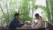 Wide shot of man and woman talking while having lunch at street cafe - 4K stock video