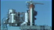 Wide shot of the Challenger Orbital Vehicle, the red external tank, and two white Solid Rocket Boosters all sitting connected atop a launch pad. There is a large metal scaffolding connected to the Orbital Vehicle, by which the astronauts will enter the shuttle. Behind the shuttle and scaffolding there is only a clear blue sky.