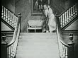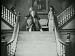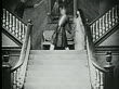 1916 B/W Wide shot Older man and woman running down stairs and man sword fighting with soldiers on landing - stock video