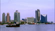 Wide shot Ship floating across Dubai Creek in front of National Bank of Dubai Building/ Dubai, United Arab Emirates - HD stock video