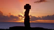 Wide shot silhouette of stone Moai statue on Easter Island with sunset + Pacific Ocean in background / South Pacific - HD stock video