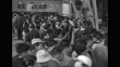 Wide Tilt down sign reads: "American Japanese Goodwill Baseball Series Yomiuri", with Japanese calligraphy on side of sign / Tilt down from exterior of stadium to crowd standing in line waiting to enter / PAN line of crowd waiting to enter / MS crowd at entrance / WS long line / MS line to purchase tickets and ticket widow / CU man purchasing ticket, prices displayed on window saying Adult 200 and children 100 / WS people entering stadium