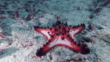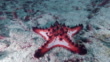 One wild red Horned Sea star (Protoreaster nodosus) Also known as the chocolate chip sea star, sits on the sand on the ocean floor. This species of Echinoderm inhabit the Indo-Pacific region and have bright colours to warn away predators. Image taken whilst scuba diving at Phi Phi islands, Krabi province, Andaman sea, Thailand.