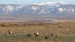 On a chilly spring morning with the Rocky Mountain Continental Divide of the Mount Zirkel Wilderness in the background, displaying male greater sage grouse strut and inflate their air sacs on their chest around nearby females or hens during the annual mating ritual on a sagebrush covered lek on the plains of Colorado's Arapahoe National Wildlife Refuge.