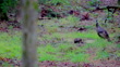 Wild turkey looking around as her chick is eating. Hen wild turkey and one chick following as they forage in woods of North Carolina.