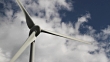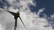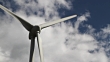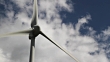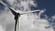 2 mw (Megawatt) wind turbine turning slowely against background of white clouds in ble sky. HD 1080