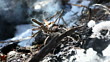 Starting a fire with small twigs and leaves on a forest floor, outdoors in winter.