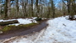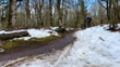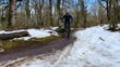Winter riding in the forest with recent snowfall visible off trail. Riding mountain bikes is a year round sport in the Seattle Washington State area. This was at a park in the Issaquah Highlands called Soaring Eagle.