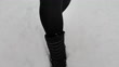 Side POV of woman's legs wearing black boots and black tights walking in the winter in the fresh snow.