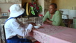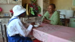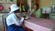 Woman and schoolgirl in rural home kitchen sitting at table having lunch with cat. The mother is making a conversation with her child. The daughter is on a lunchbreak from school and in a rush. She is eating with her hands. She is wearing her school uniform and is telling her mother about her day. They live in a small home in Malealea, Lesotho.