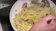 Woman cooking spaghetti with clams, steam from the pan. Slow motion.