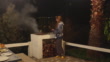 4k video footage of a young woman with long hair with their dog - pug breed enjoying a twilight time relaxing at the patio making burgers on the open fire grill and working by laptop