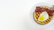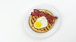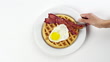 CU Woman hand entering setting down round white plate with Belgium waffle, egg sunny side and two strips of bacon / Omaha, Nebraska, United States - HD stock video