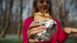 Woman holding a burrito wrapped in tin foil as a fashionable accessory - 4K stock video