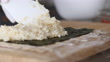 A Japanese woman making sushi rolls with rubber gloves at home.