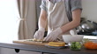 A Japanese woman making sushi rolls with rubber gloves at home.
