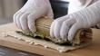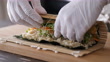 A Japanese woman making sushi rolls with rubber gloves at home.