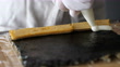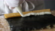 A Japanese woman making sushi rolls with rubber gloves at home.