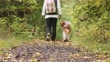 Woman out for a walk in the woods with her dog - 4K stock video