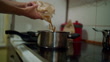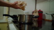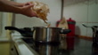 Woman pouring penne from package into hot and boiled water in the bowl, preparing it al dente - HD stock video