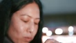 A woman savors Panipuri (Golgappa), a beloved Indian street food snack. Holding a small metal bowl, she pops the crispy, filled Golgappa into her mouth and munches contentedly with her mouth closed amidst the hazy night lights of a street food market.