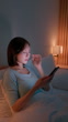 close up of asian woman sit by bed scroll smartphone on bed at night in home - she is rubbing eyes feels sore and tired