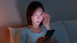 close up of asian woman sit by bed scroll smartphone on bed at night in home - she is rubbing eyes feels sore and tired