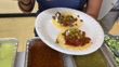 Woman serving salsa verde over her Mexican tacos in a Mexican food buffet