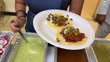 Woman serving salsa verde over her Mexican tacos in a Mexican food buffet - 4K stock video