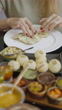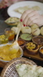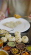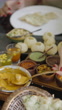 Woman tears apart flat bread scoops up butter chicken onto the tore piece. - 4K stock video