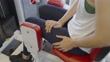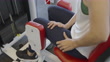 Woman with persistence doing a body training on leg abduction machine gym equipment and ending up hurting her upper leg and hip