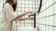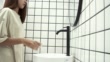 Woman on white shirt washing hands with water in toilet bathroom. Looking at the mirror.