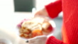 Woman walking and carrying plate with taco, prepared potato and salad to restaurant table at self service restauran
