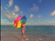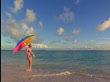 Woman with bikini + straw hat walking along ocean surf spinning colorful umbrella on shoulder - stock video