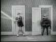 1924 B/W WS Woman (Louise Carver) with plank chasing man (Charles Murray) around and through doors, he hides and she hits doors with plank, then man hits woman with plank / USA - stock video