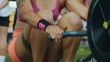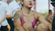 A women pulling back on a Concept2 rower, with a monitor visible and a coach or observer present, all within a vibrant fitness gathering - 4K stock video