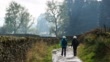 Women walking near Moss Eccles tarn with smoke from brash burning behind, Sawrey, Lake District, UK. - 4K stock video