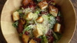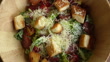 Wooden bowl filled with Caesar salad, fresh green vegetables, parmesan cheese, and crunchy croutons, healthy diet food concept - 4K stock video