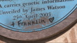 Work of Rosalind Franklin finally recognised on blue plaque; ENGLAND: Cambridge:EXTClose shot blue plaque with '+ Rosalind' written at bottom